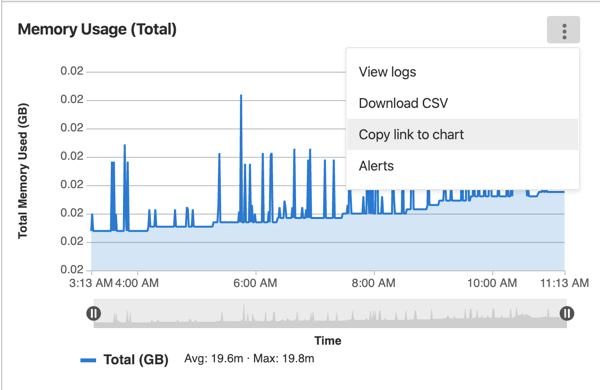 You can also embed a single chart. To get a link to a chart, click the {ellipsis_v} More actions menu in the upper right corner of the chart, and select Copy link to chart, as shown in this example:
