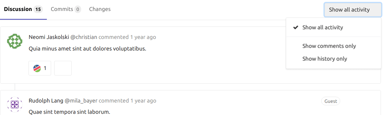 - Show all activity: Display all user comments and system notes. (issue updates, mentions from other issues, changes to the description, and so on).