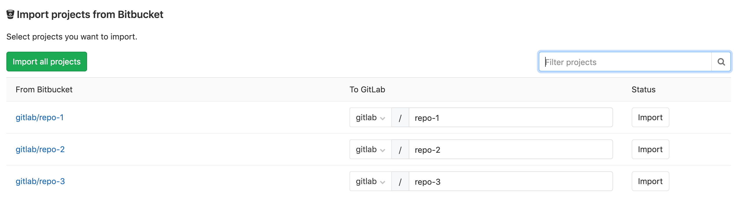 Select the projects that you'd like to import or import all projects. You can filter projects by name and select the namespace each project will be imported for.